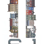 The second instalment of the George Street strip of St. John’s, Newfoundland, as seen from the west end looking east in the year 2000. Done in the same architectural caricature style as the first George Street painting.