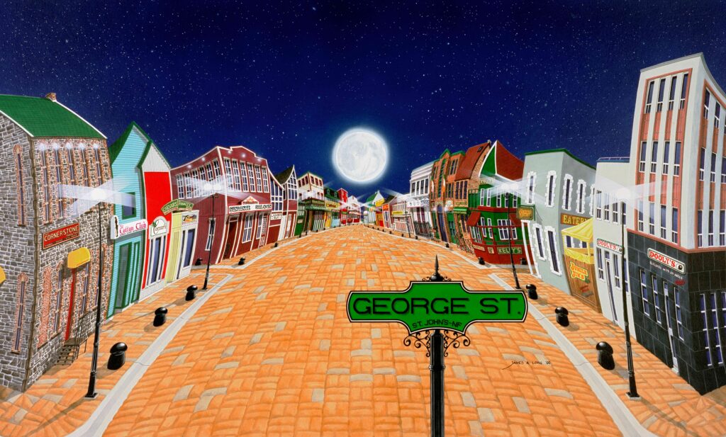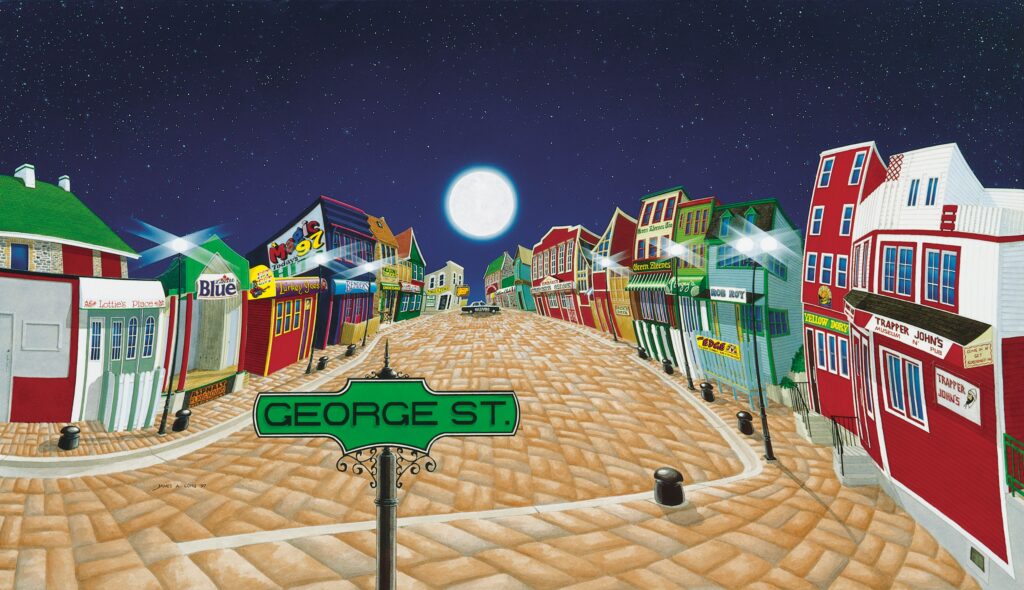 The original and unique artwork of the never before painted George Street of St. John’s, Newfoundland, looking west down the street.