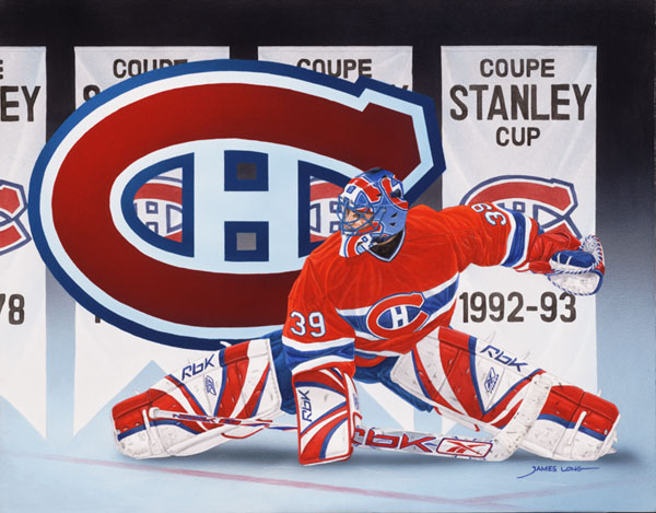 An original painting portraying a goaltender wearing the red, blue, and white of the Montreal Canadiens, set to the backdrop of some of Montreal’s numerous Stanley Cup Banners.