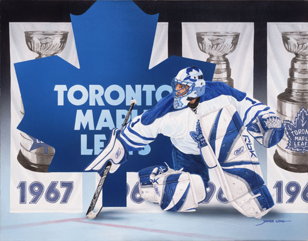An original painting portraying a goaltender wearing the blue & white colours of the Toronto Maple Leafs, set to the backdrop of some of Toronto’s Stanley Cup Banners.