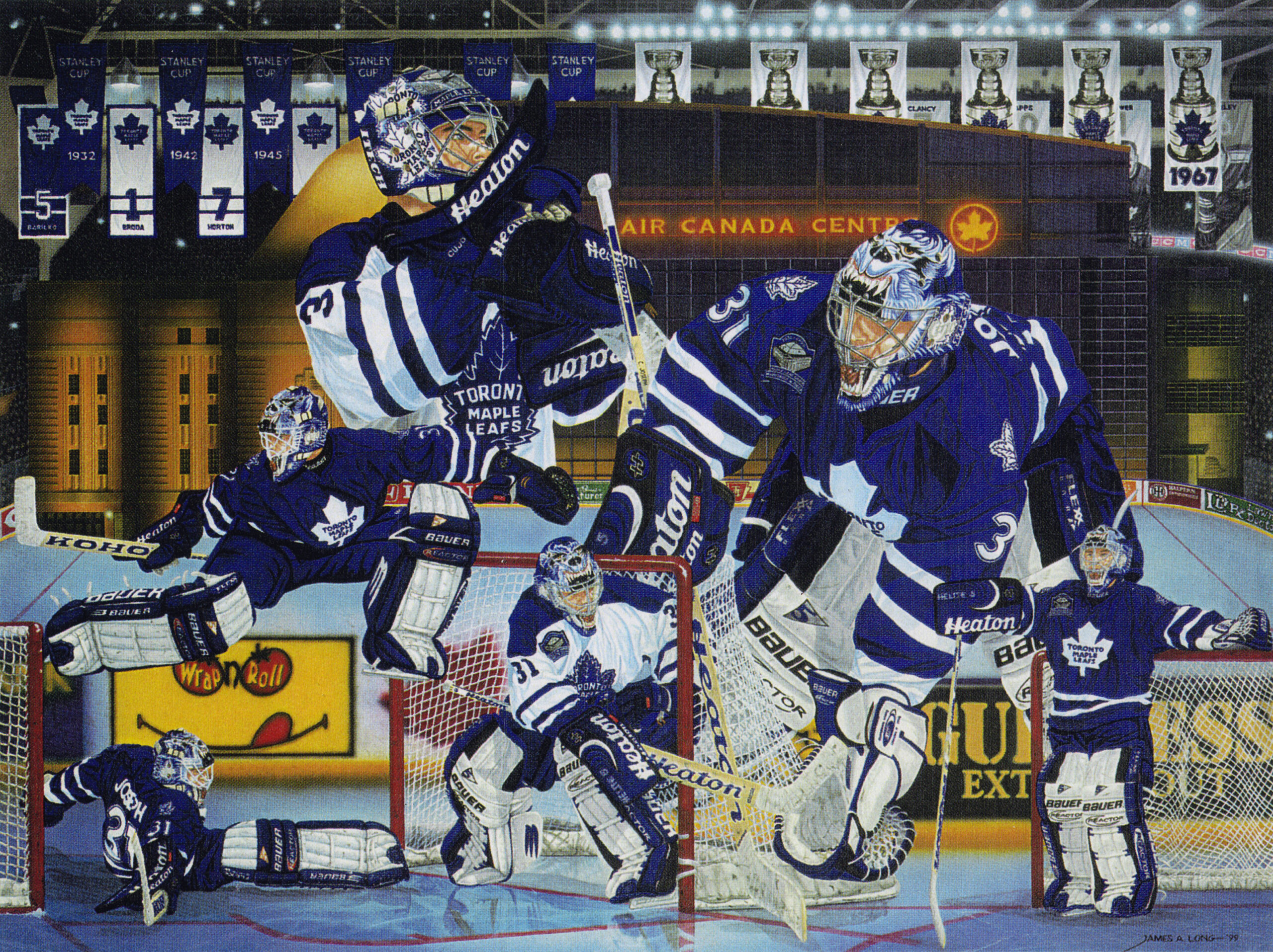 An original painting portraying a goaltender wearing the blue & white colours of the Toronto Maple Leafs, set to the backdrop of some of Toronto’s Stanley Cup Banners.
