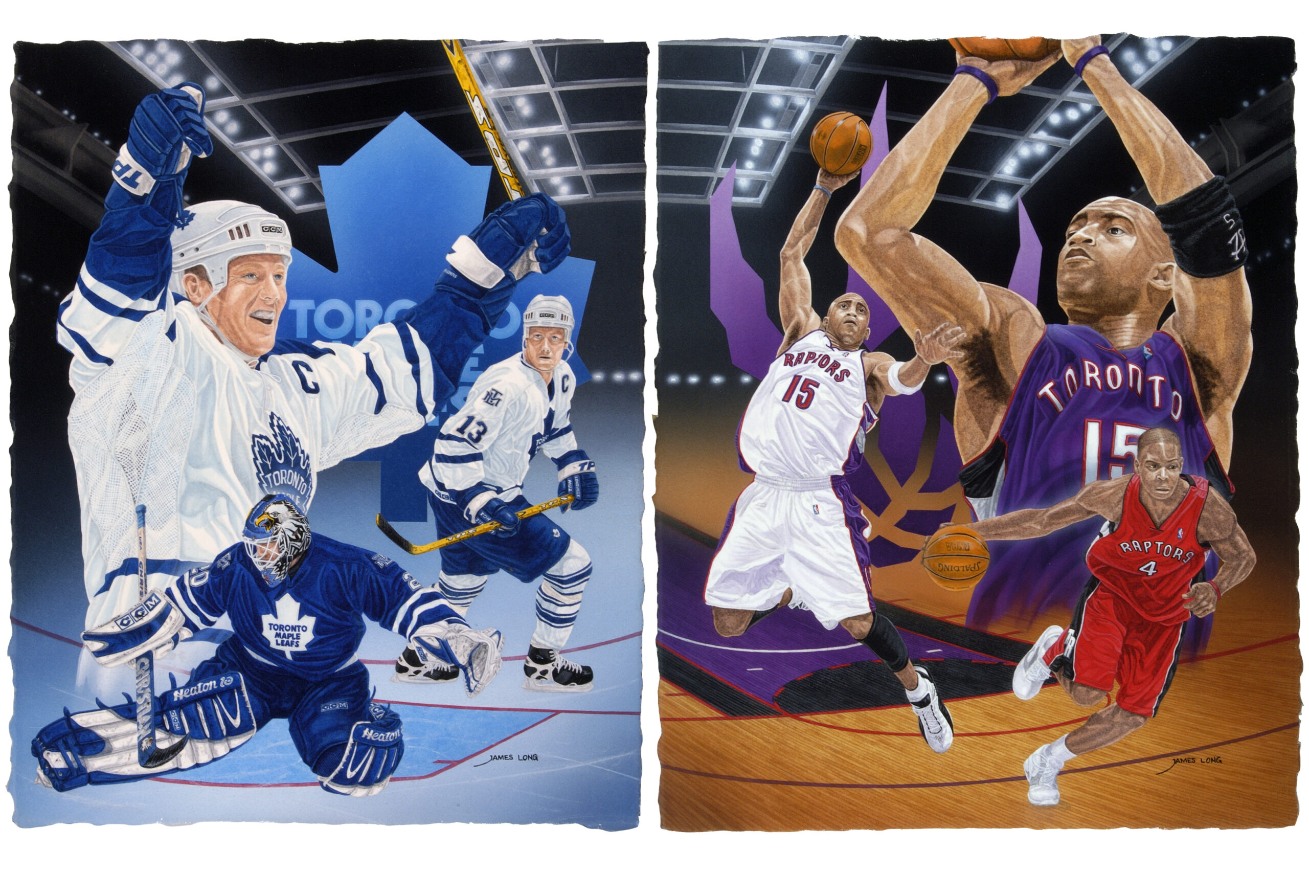 Original artwork commissioned by MLS&E as a gift to their Platinum season ticket holders showcasing the Toronto Maple Leafs stars: MATS SUNDIN and Goaltender ED BELFOUR; as well as the Toronto Raptors: VINCE CARTER and CHRIS BOSH.Original painting part of MLS&E’s Collection.