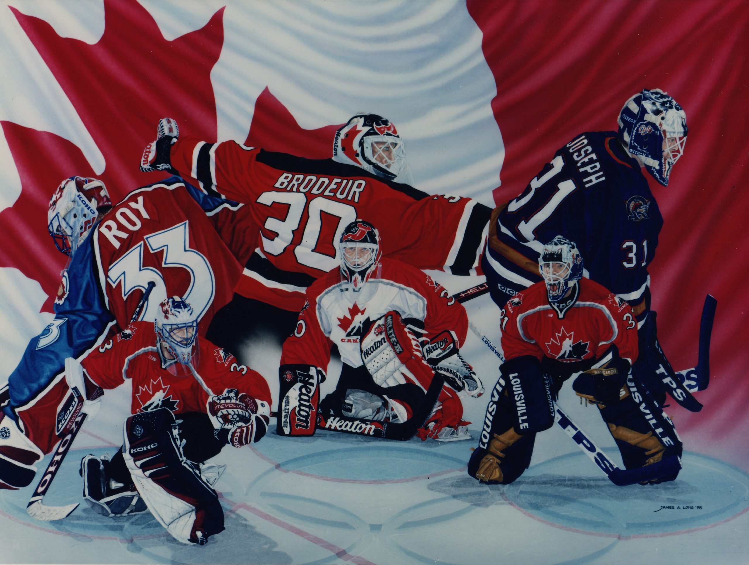 This piece showcases the three goalies invited by Canada to represent their country: PATRICK ROY, MARTIN BRODEUR, and CURTIS JOSEPH.