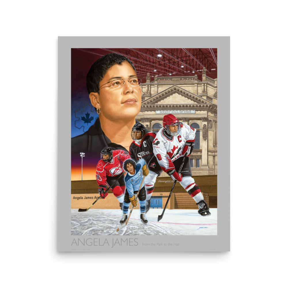 As the first black captain of Team Canada, Angela has made history on and off the ice in so many areas, and this painting captures the various stages of her journey as she rose to dominance in Canada’s most loved sport. Angela’s journey is a tough, inspiring and amazing story of rising above the odds.