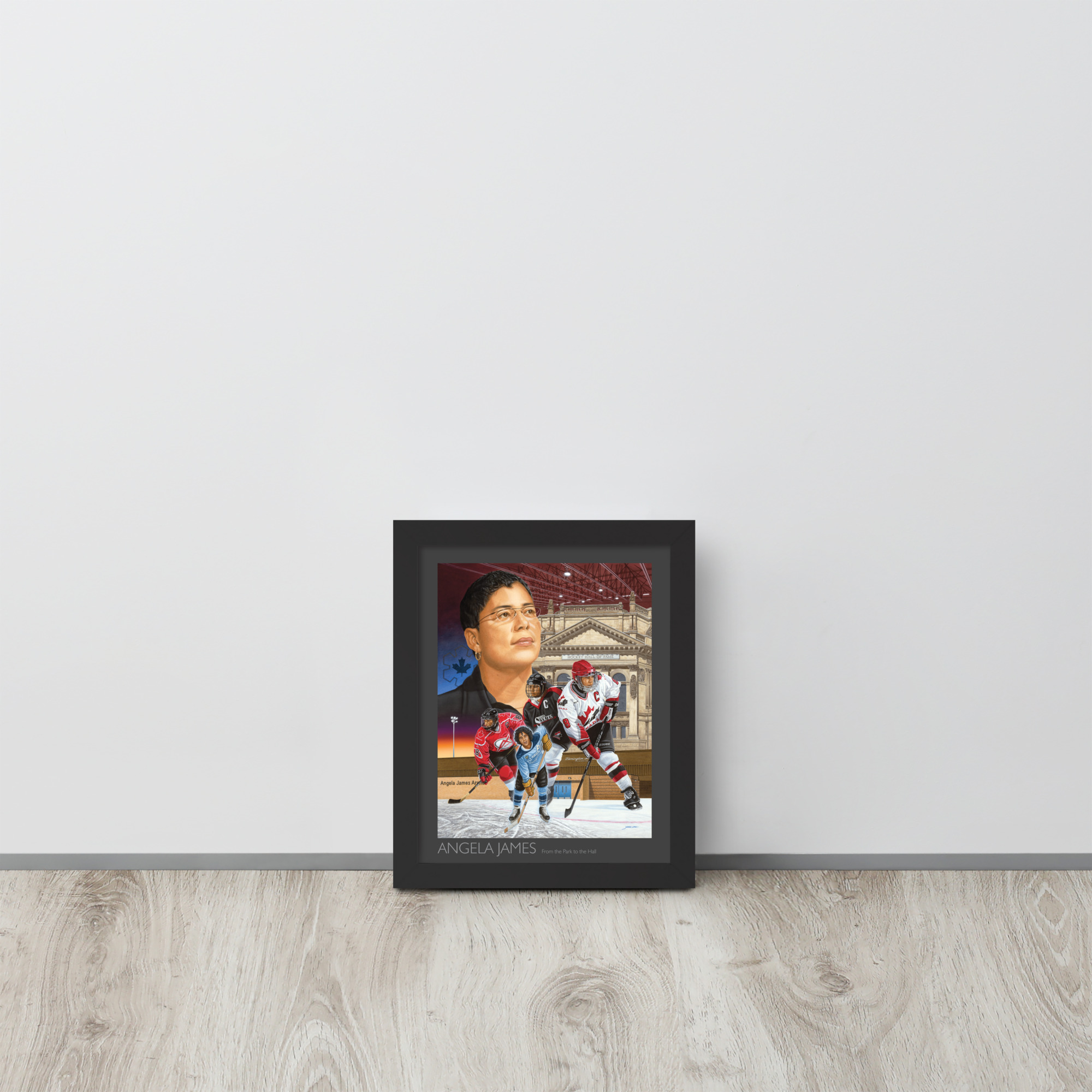 As the first black captain of Team Canada, Angela has made history on and off the ice in so many areas, and this painting captures the various stages of her journey as she rose to dominance in Canada’s most loved sport. Angela’s journey is a tough, inspiring and amazing story of rising above the odds.