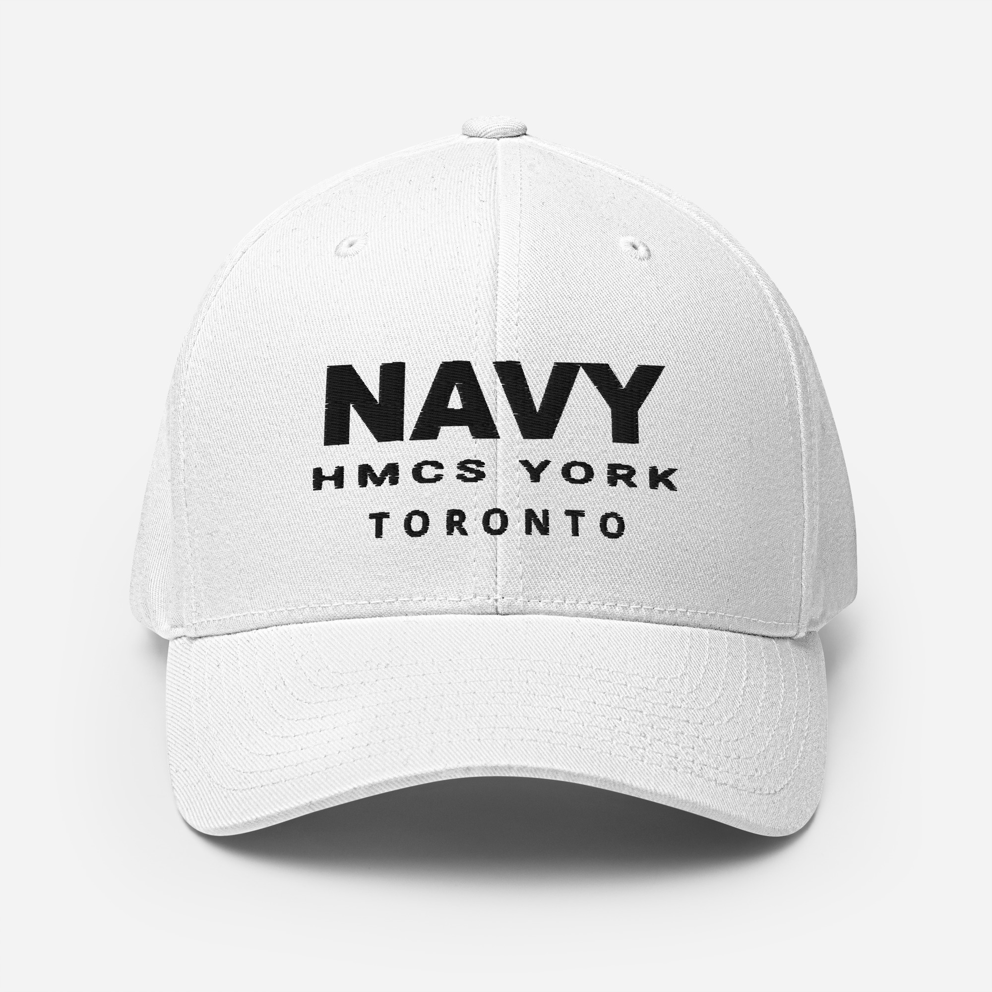 Embroidered black text on front and back of cap.
