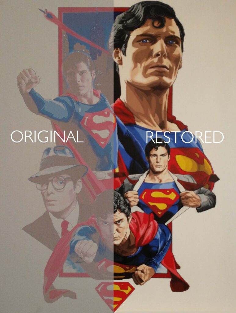 The owner, a huge Superman fan (as well as a huge fan of the legendary Christopher Reeves, arguably the best Superman to date), bought this piece while travelling almost 2 decades ago. The painting had faded so badly, that some of the colours were almost completely washed out.